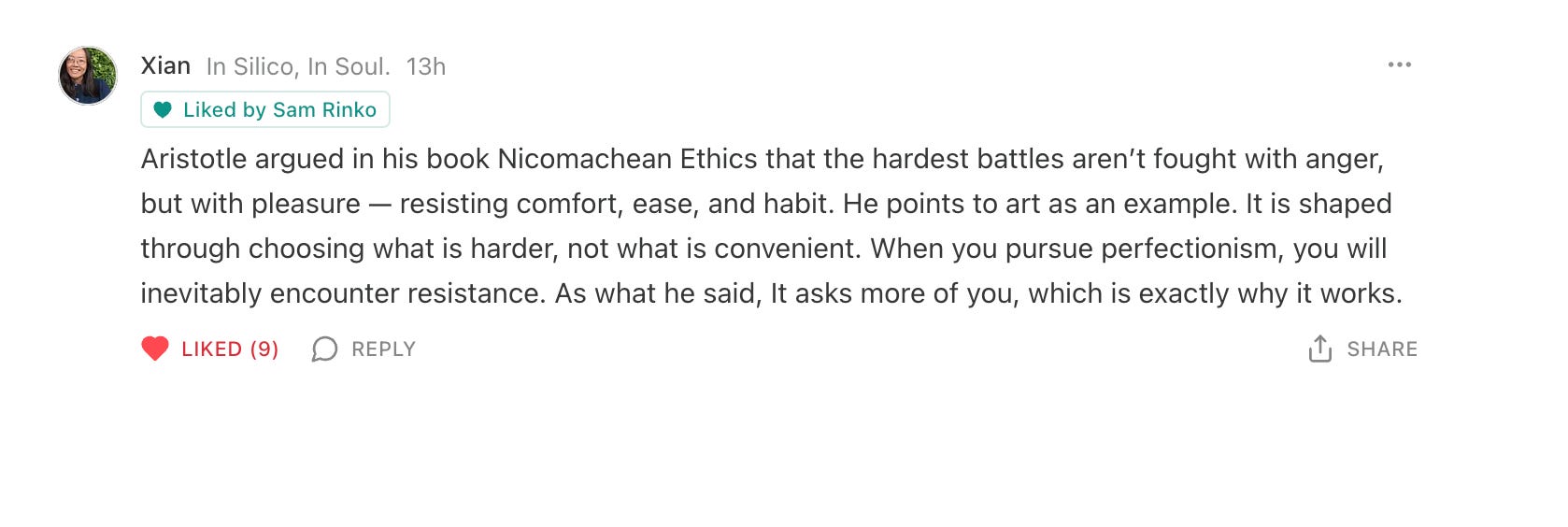 I am about halfway through Nicomachean Ethics, and this is my first time reading it. I cannot believe how modern these ideas feel, despite being written over 2,300 years ago. I am thinking of starting a weekly or monthly series to reflect on them through the lens of product and design. Let me know in the comments if you would like to read more.